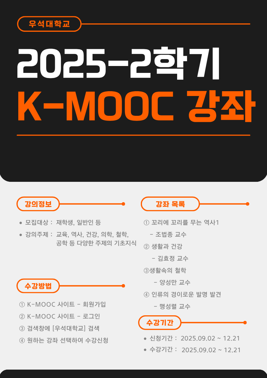 - 우석대학교 2025년 2학기 K-MOOC 강좌 수강 안내(2차)